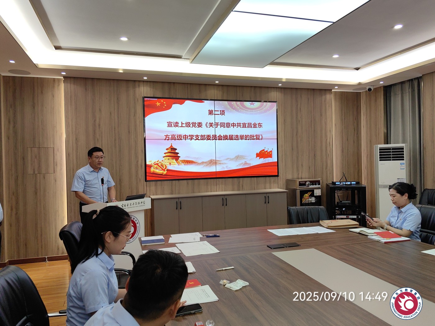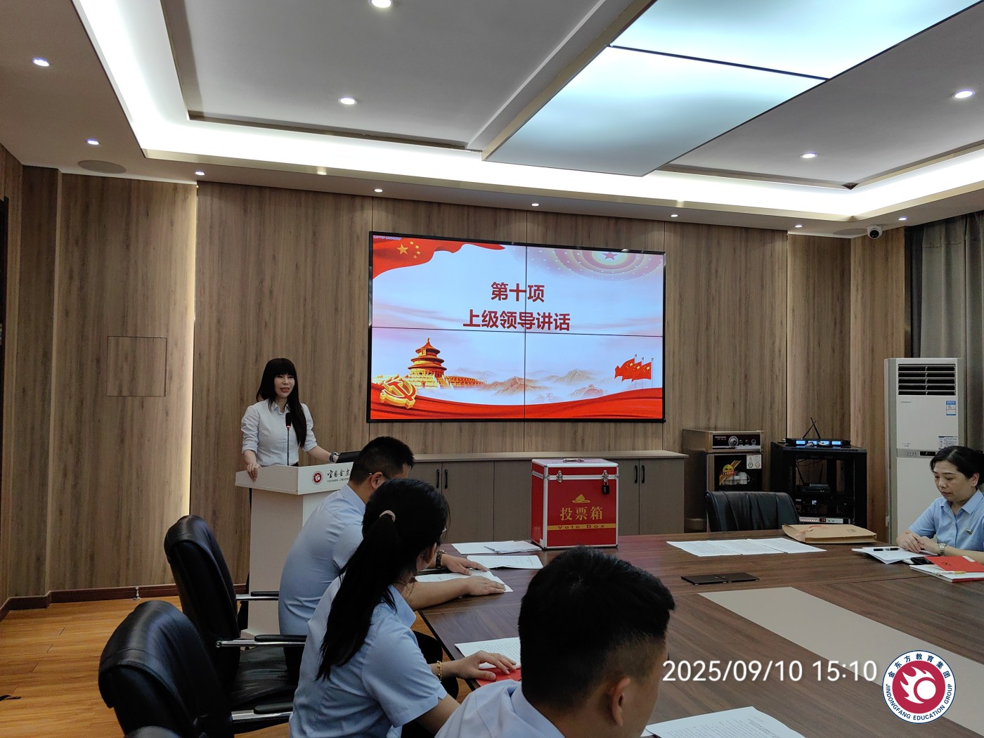 2025年9月10日上午,金东方高中党支部在学校党员活动室召开全体党员大会,顺利完成支部委员会换届选举工作。集团党委副书记菅燕燕同志莅临现场监督指导。